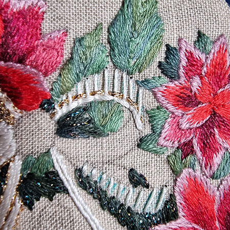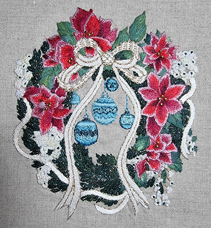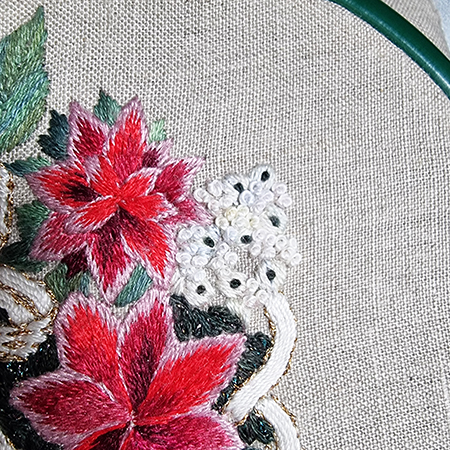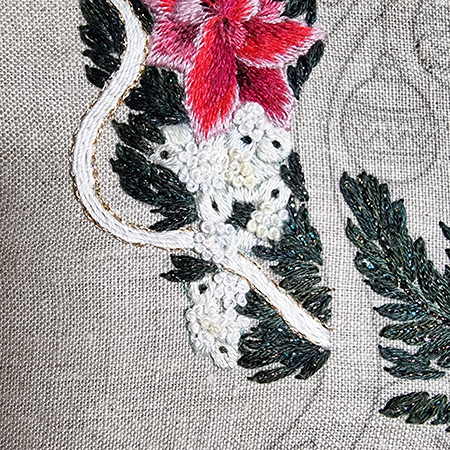To embroider the mistletoe berries, I chose to play with two complementary textures to give depth to this small, single-color motif, which might otherwise be lost among the richness of the other elements of the wreath.