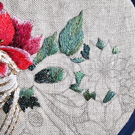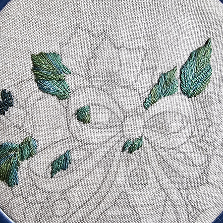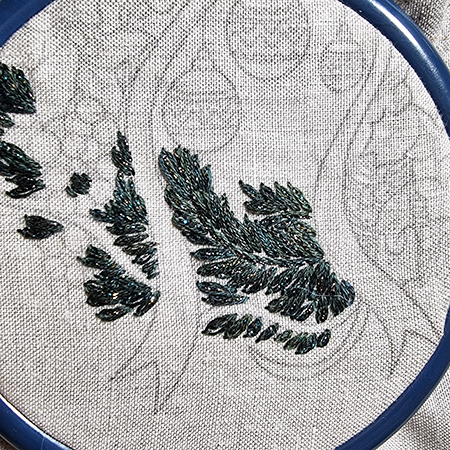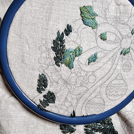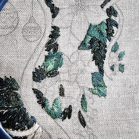To create the fir branches and their needles, I worked with large lazy daisy stitches, embroidered with two strands of thread. Some of these stitches are doubled to give the whole piece more density and volume.