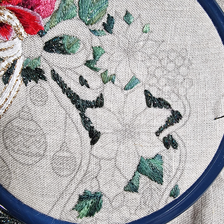 Once these foundations were in place, I added a few straight stitches with a metallic thread to intensify its shine and evoke the light falling on the branches.