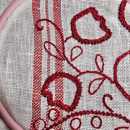 In its most conventional execution, this embroidery is worked in white on a white background. For reasons of better readability of the explanatory images, I have done this work in red on 28-count Italian fabric. I usually work Schwalm embroidery on a thinner fabric (38 counts), but I thought this choice would facilitate the execution of a first realization, if it is your case, as well as the reading of the pictures.