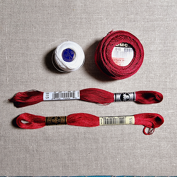 In terms of threads, I used #8 Perle cotton, #25 “Broder spécial” cotton and stranded cotton, all in DMC color 815. I also used DMC white lace thread #80 to attach the thread bundles in some designs (explanations will follow…). If you can’t find this lace thread, you can substitute it with a relatively thick cotton sewing thread.