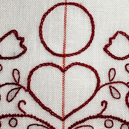 Make the coral stitch on the outside and very close to the chain stitch. The addition of this stitch is absolutely necessary to reinforce the contours of the designs because some threads will be removed in these patterns.