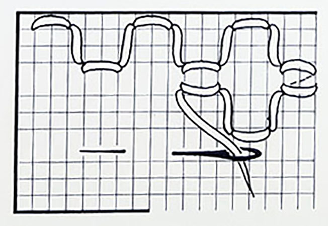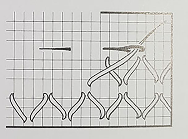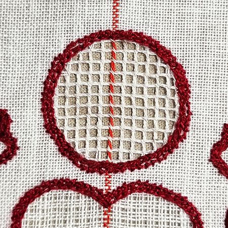 To form the grid, wrap the white Perle cotton around 3 threads at a time and over a distance of 2 packages of 3 threads. Work in a “staircase” pattern.