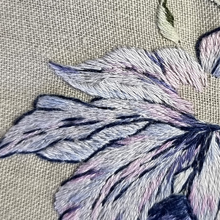 Broder le revers du pétale tout d’abord au passé plat avec la couleur 3747 puis ajouter la couleur 341 sur toute la partie inférieure.