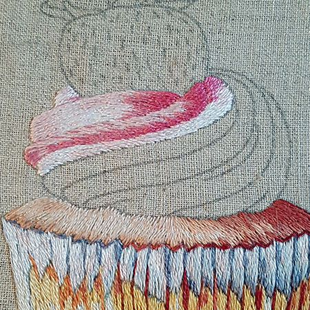To embroider this part of the cupcake, I used the stranded DMC threads B5200, 3685, 961, 962, 963 as proposed in the introductory article.