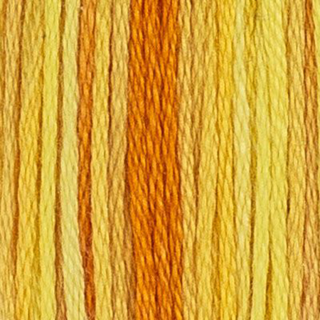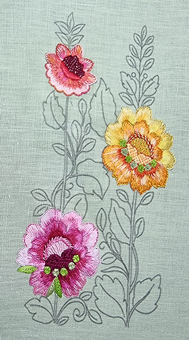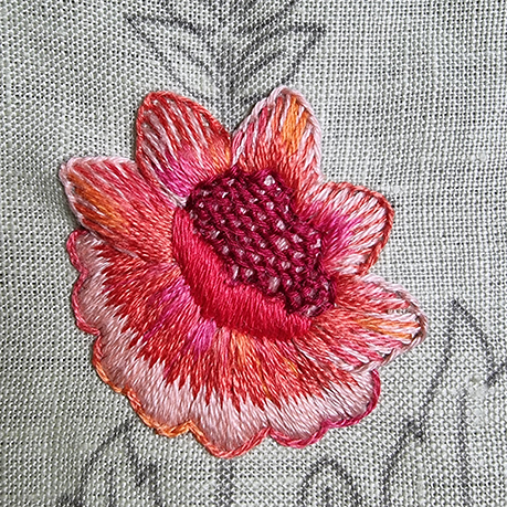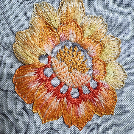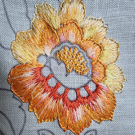 The 6 outer petals of the upper part of the flower are embroidered with the colors 727, 725, Daffodil 47A. The inner petals and those at the bottom are embroidered with the colors 972, 741, 720 and Tropicana 85C. The stamens are embroidered with DMC 3348 and 907.
