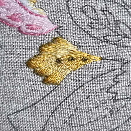 Below you will find the explanations and photos needed to embroider the second row of petals (2) located at the back of the flower as well as the center (3) and the small leaf that accompanies it.