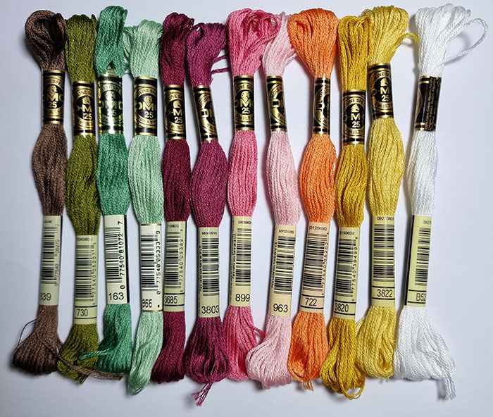 For this, we will use mainly long and short stitch and we will embellish it if necessary with some traditional stitches such as stem stitch, lazy daisy stitch, or French knot. The laying of the colors will be simple because the threads used are only 12 and are applied in an easy way.