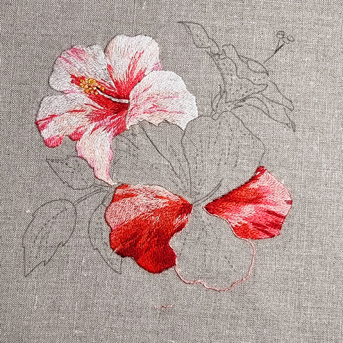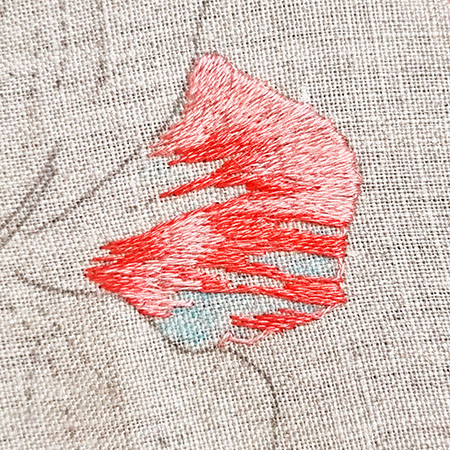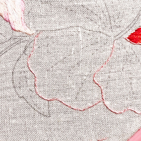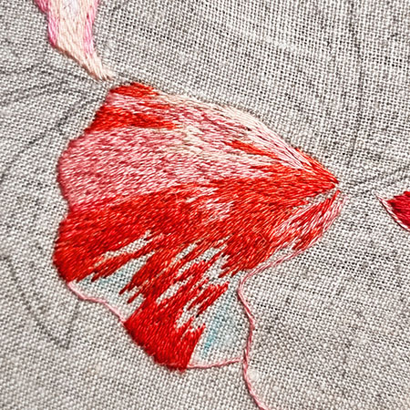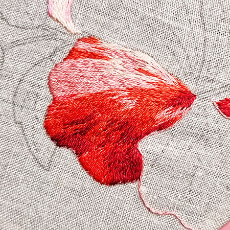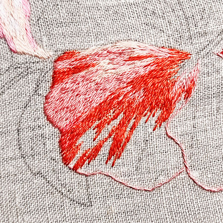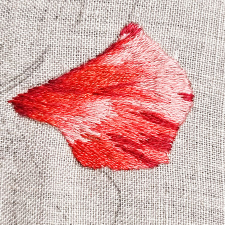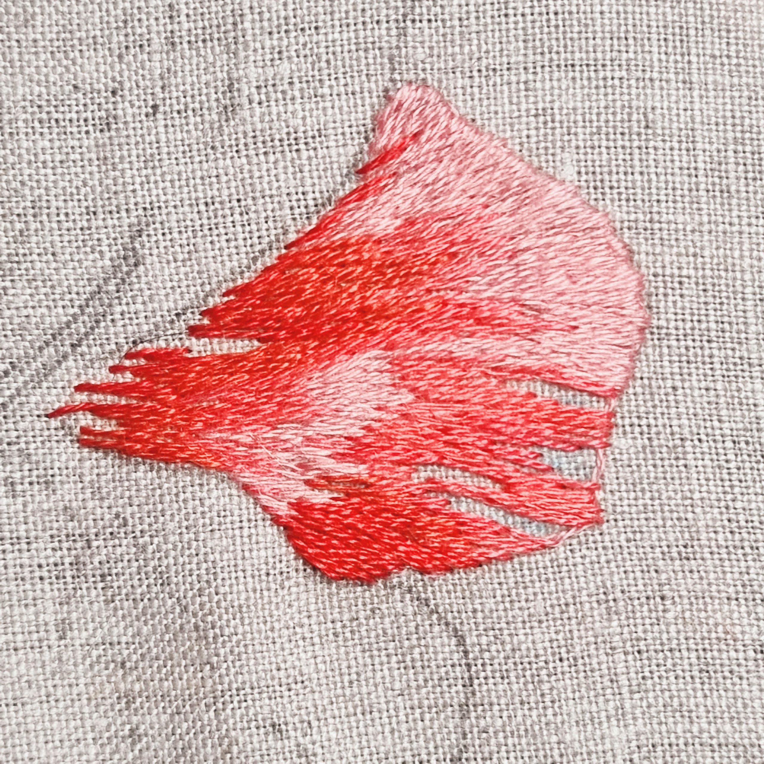 Ce pétale est brodé avec les couleurs n° 353, 760, 350, 817 et 816.