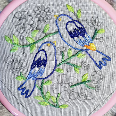 The contours of the birds are embroidered with stem stitch 3 threads. The wings are made with stem stitch and blanket stitch all with 2 threads. Add satin stitch 1 thread under the wings of the right bird as well as 2 straight stitches 2 threads for the beak and a French knot 2 threads 2 wraps for the eye.