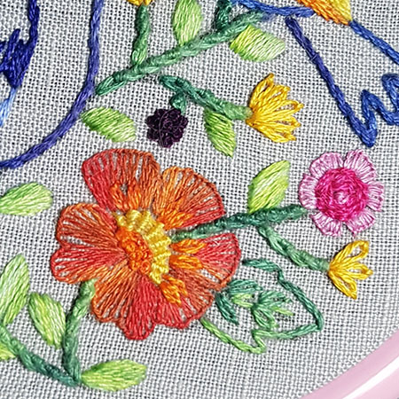 The petals of this flower are embroidered with blanket stitch 1 thread and the center with several rows of backstitch 2 threads, completed with a French knot 2 threads 2 wraps.