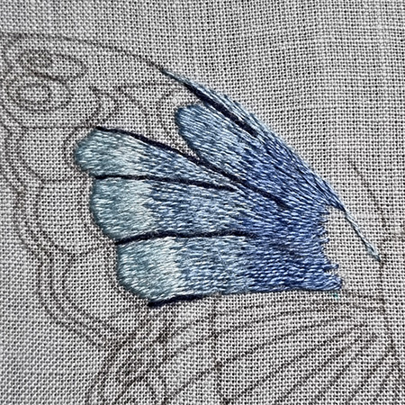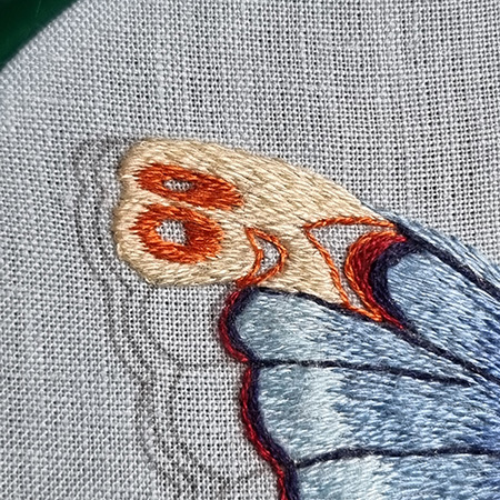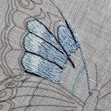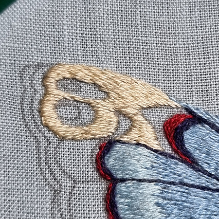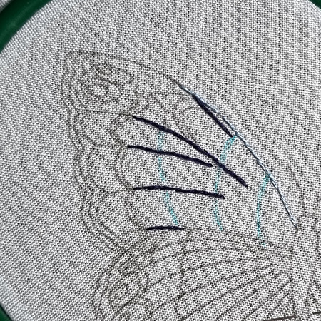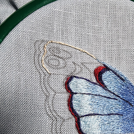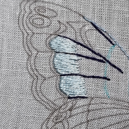 Commencer par souligner le bord extérieur de l’aile et les veines au point arrière repiqué avec 1 fil.