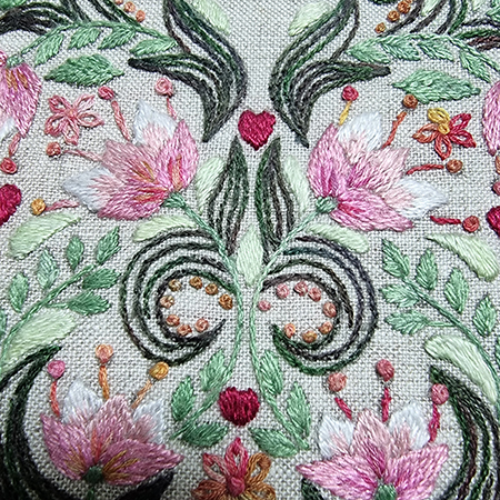 The arabesques are embroidered using stem stitch with 1 thread and color 69.