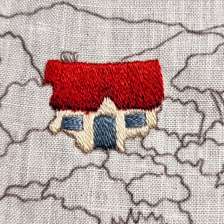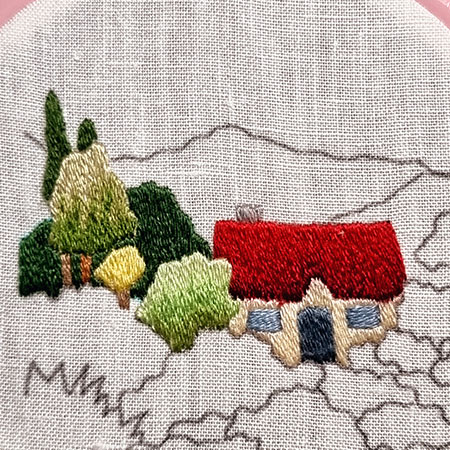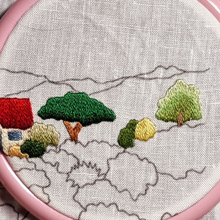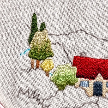 I used DMC 924 thread to embroider the outline of the mountains in stem stitch with 1 thread.