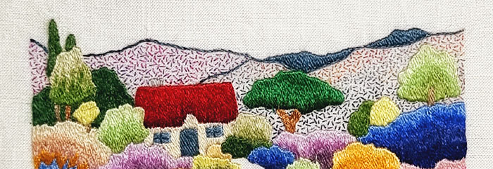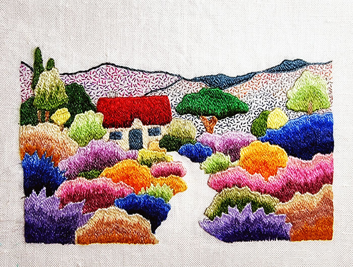 To make the inside of the mountains, I used a seeding stitch with 1 thread and favored the use of variegated threads to match the main color palette.