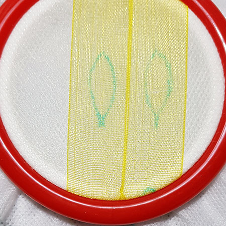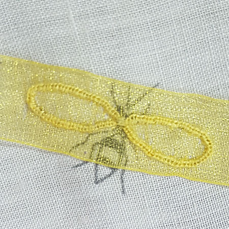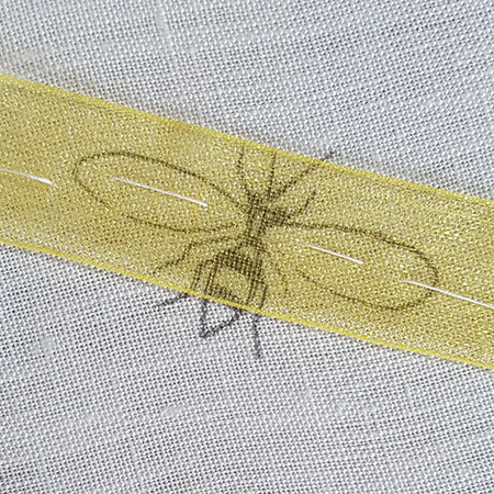 Place a 1.5 cm wide organza ribbon on the wings of the wasp printed on the fabric. Install the embroidery into the hoop and hold the ribbon with a few dots.