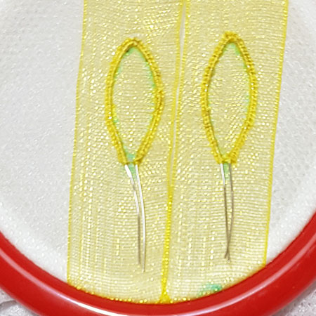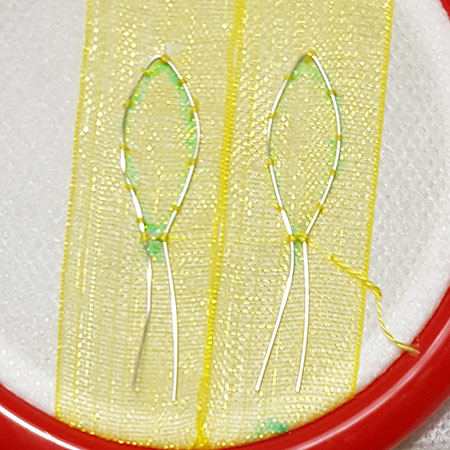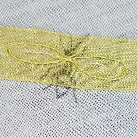 Embroider the outline of the wings with a very fine blanket stitch 1 thread over the couching. The ribbon is now firmly secured and you can cut the unnecessary parts to get clear wings.