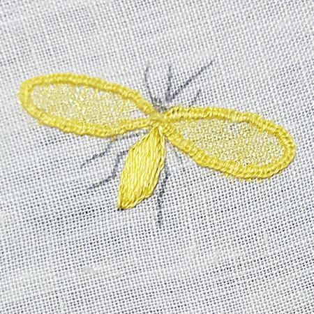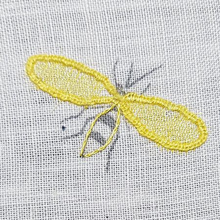 Embroider a blanket stitch 1 thread over the wire for the contour of the wings.