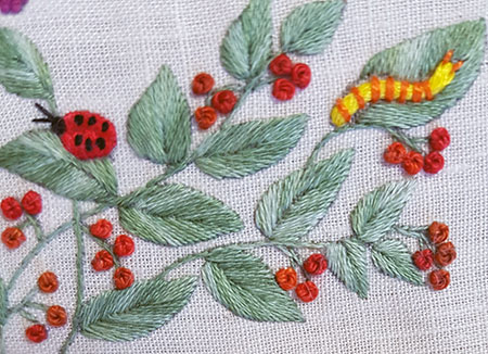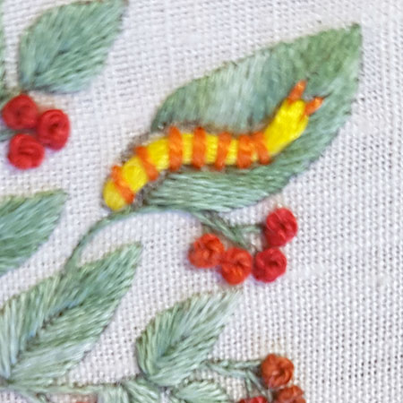 The caterpillar is embroidered in couching with 12 threads for the body and 3 threads for the rings.