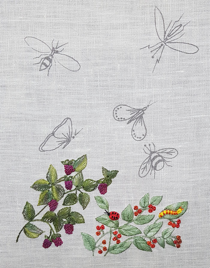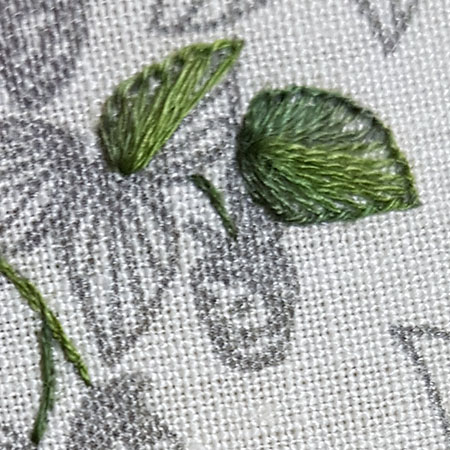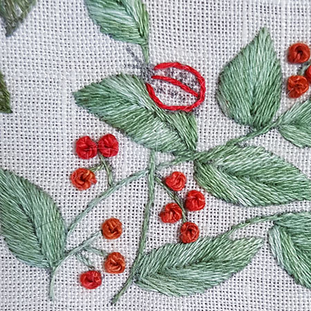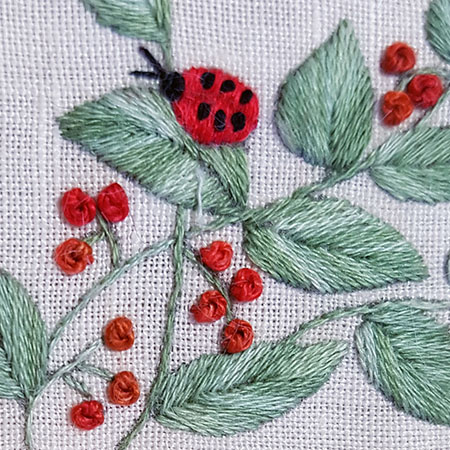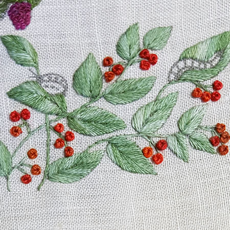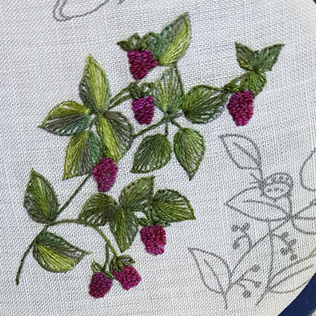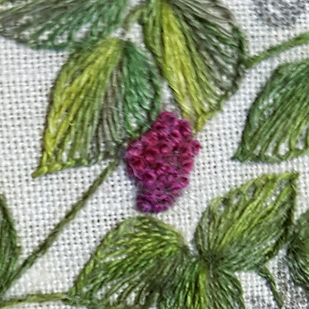 The raspberries are embroidered in French knot with 2 threads and 2 wraps.