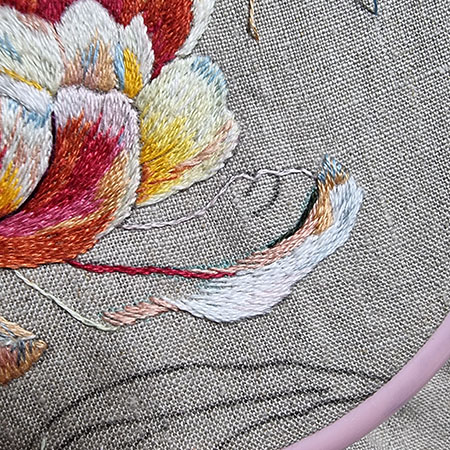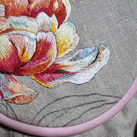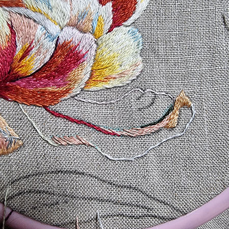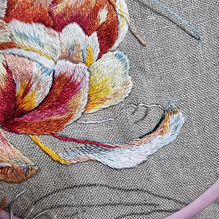 I didn’t add any new thread colors to embroider the last petal, and here are the ones I used for the leaf work.