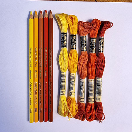 To clarify and simplify the palette of threads we will use, I made a quick sketch with colored pencils. This exercise enabled me to outline the dominant shades and make a first choice of colors, which I present below.