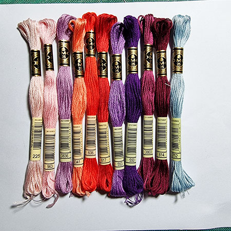 DMC stranded cotton 225, 963, 3836, 3341, 606, 817, 553, 550, 3803, 814, 3752